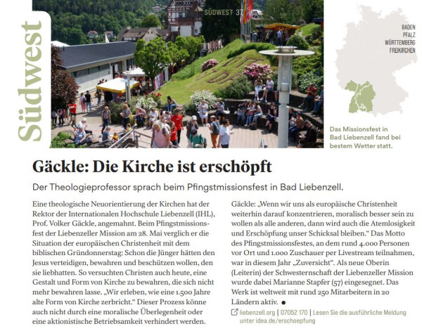 Prof. Gäckle: "Wir erleben, wie eine 1.500 Jahre alte Form von Kirche zerbricht." Dieser Prozess könne auch nicht durch eine moralische Überlegenheit oder eine aktionistische Betriebsamkeit verhindert werden. So Prof. Gäckle auf dem Pfingstmissionsfest in Liebenzell vor 4.000 Besuchern und 1.000 Zuschauern im Livestream.